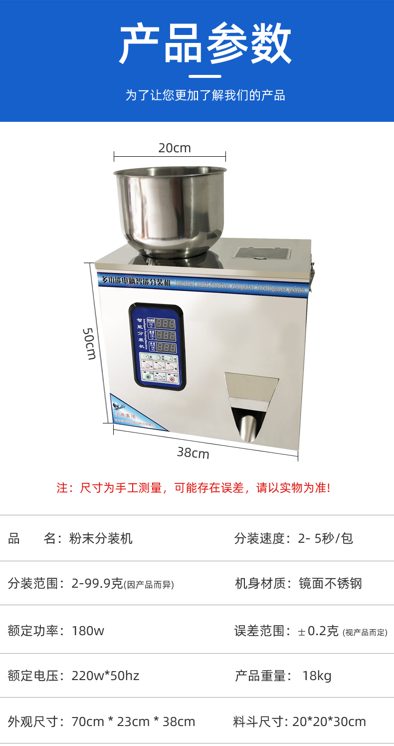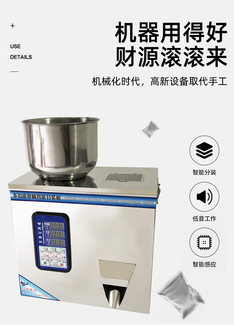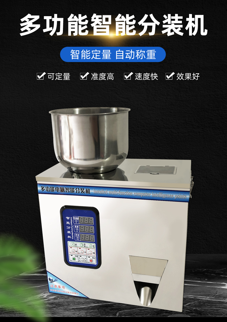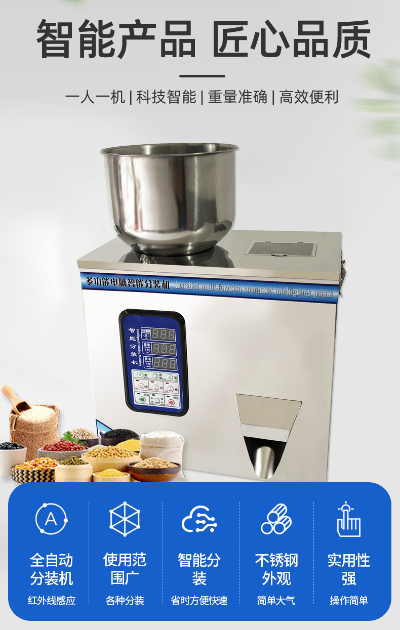 鑄衡生產的粉劑分裝機是自主開發的高智能產品,配合高精度傳感器,具有包裝速度快、操作簡便、結構緊湊的特點。該粉劑分裝機適用于大米,谷物,藥材,茶葉,干貨,零件,水果,調味料,種子,粉狀物,化肥等非粘性物料的定量分裝。